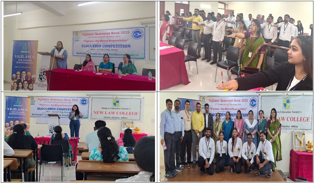 Elocution competition on VAW-2025 theme was conducted for students of New Law College, Mumbai as an awareness building activity on 08.10.2025. Total 20 students took part in the competition. Prizes/ medals were distributed to the winners of the competition. Principal of College has administered the Integrity Pledge to the participating students, professors and other staff members.